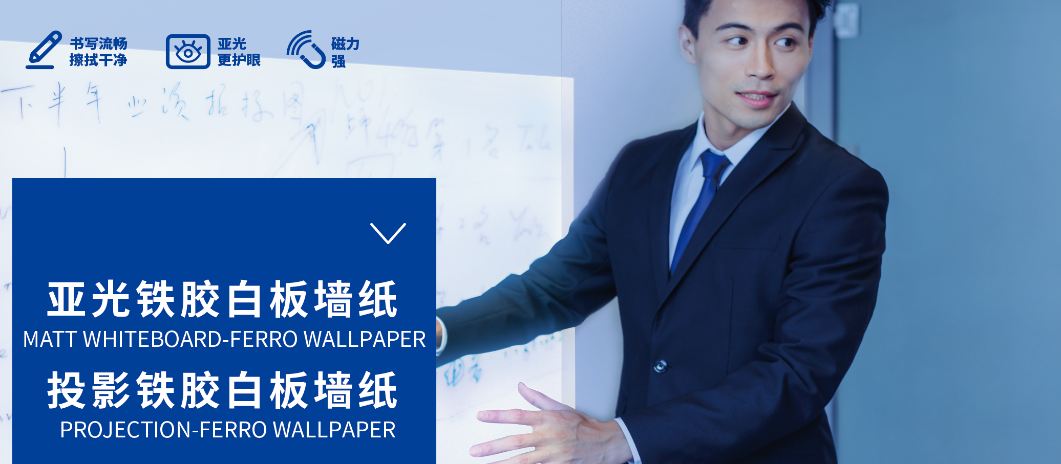 亞光或投影鐵膠白板墻紙的表面是光澤度柔和的PET白板膜,不反光的效果在大面積安裝后的質(zhì)感非常舒服。